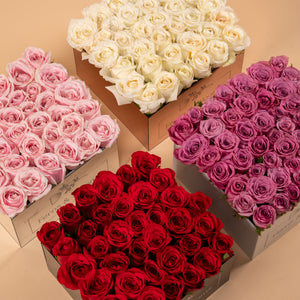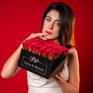 This luxurious floral presentation pairs timeless blooms with the sleek elegance of a premium acrylic box. Available in black, white, rose gold, or silver, the box adds a modern, polished touch to the arrangement, making it as much a keepsake as it is a gift. Choose from exquisite rose colours—classic red for love and passion, pure white for grace and sincerity, vibrant purple for admiration and charm, or jumilia for a delicate blend of warmth and elegance.
