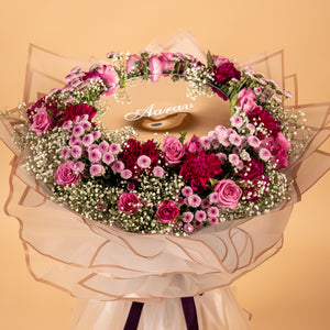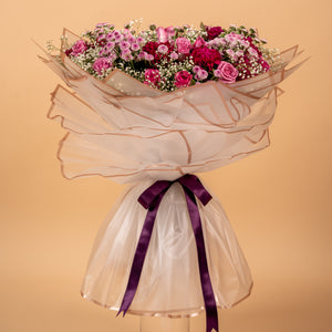 Elegant and enchanting, this arrangement celebrates the beauty of purple in all its shades. Featuring purple roses that symbolise admiration and enchantment, purple carnations for love and fascination, and purple button flowers for charm and cheerfulness, the bouquet comes alive with depth and vibrancy. Soft gypsy fillers add a delicate touch, while the mirror base reflects the blooms in a captivating glow. Wrapped in white transparent packing, this large bouquet feels both luxurious and graceful.