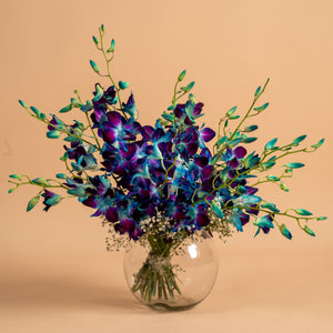 Exotic and captivating, this arrangement highlights the rare beauty of blue orchids, paired with the lush greenery of dracaena leaves and the delicate charm of gypsy fillers. The striking blue orchid symbolises peace, rarity, and admiration, while dracaena adds structure and depth, creating a bold yet balanced design. Gentle gypsy accents soften the look, lending a graceful, airy finish.