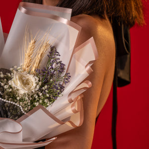 This refined bouquet combines the pure elegance of white roses with the rustic charm of wheat grass and the subtle sparkle of gold gypsy fillers. White roses symbolise sincerity, grace, and new beginnings, while the textured wheat grass and golden accents add depth and sophistication. Wrapped in premium black paper and finished with a neat ribbon knot, it’s a timeless arrangement perfect for both celebrations and heartfelt gestures.