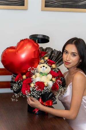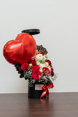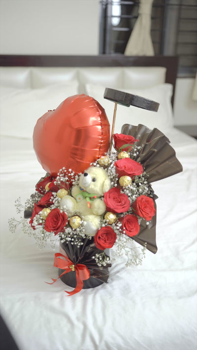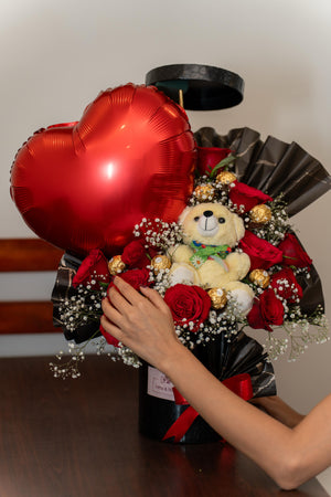 Housed in a sleek black toughened box, this arrangement brings together passionate red roses, indulgent Ferrero Rocher chocolates, an adorable soft toy, and a playful foil balloon — each element adding its own charm to the experience. Together, they create a gift that feels personal, joyful, and unmistakably special.