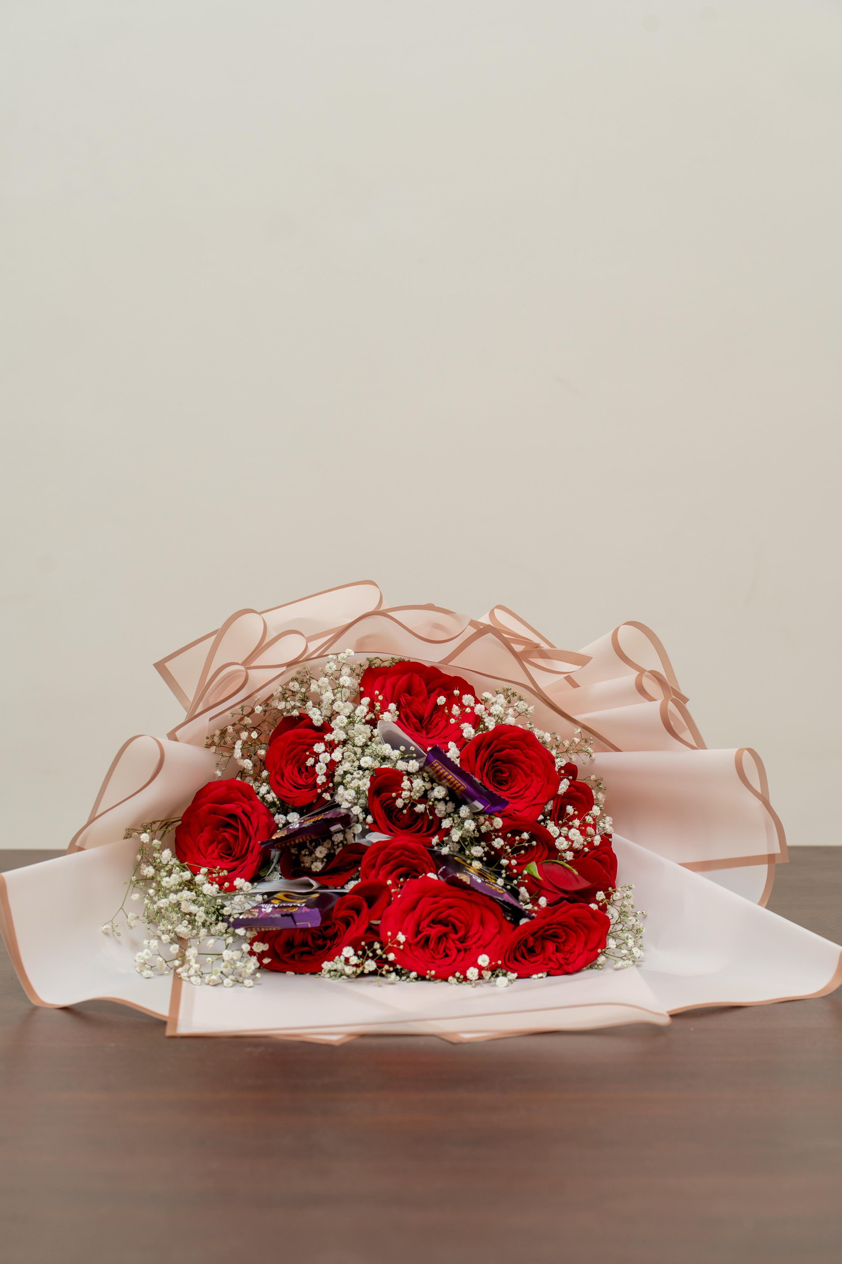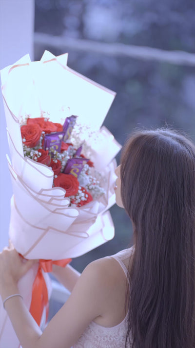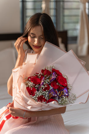 This romantic arrangement pairs a dozen rich red roses, symbolising love and commitment, with smooth Dairy Milk Silk chocolates that add a touch of indulgent sweetness to the moment.