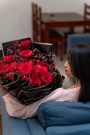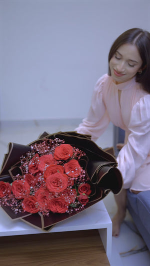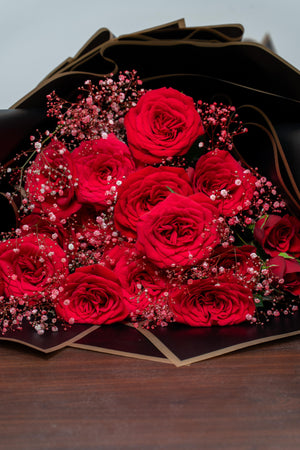 Featuring an abundant arrangement of lush red roses, this bouquet speaks of passion, commitment, and love that’s meant to be felt fully. Soft gypsophila fillers bring balance and romance, while floral hydration foam ensures the blooms stay fresh and radiant for longer.