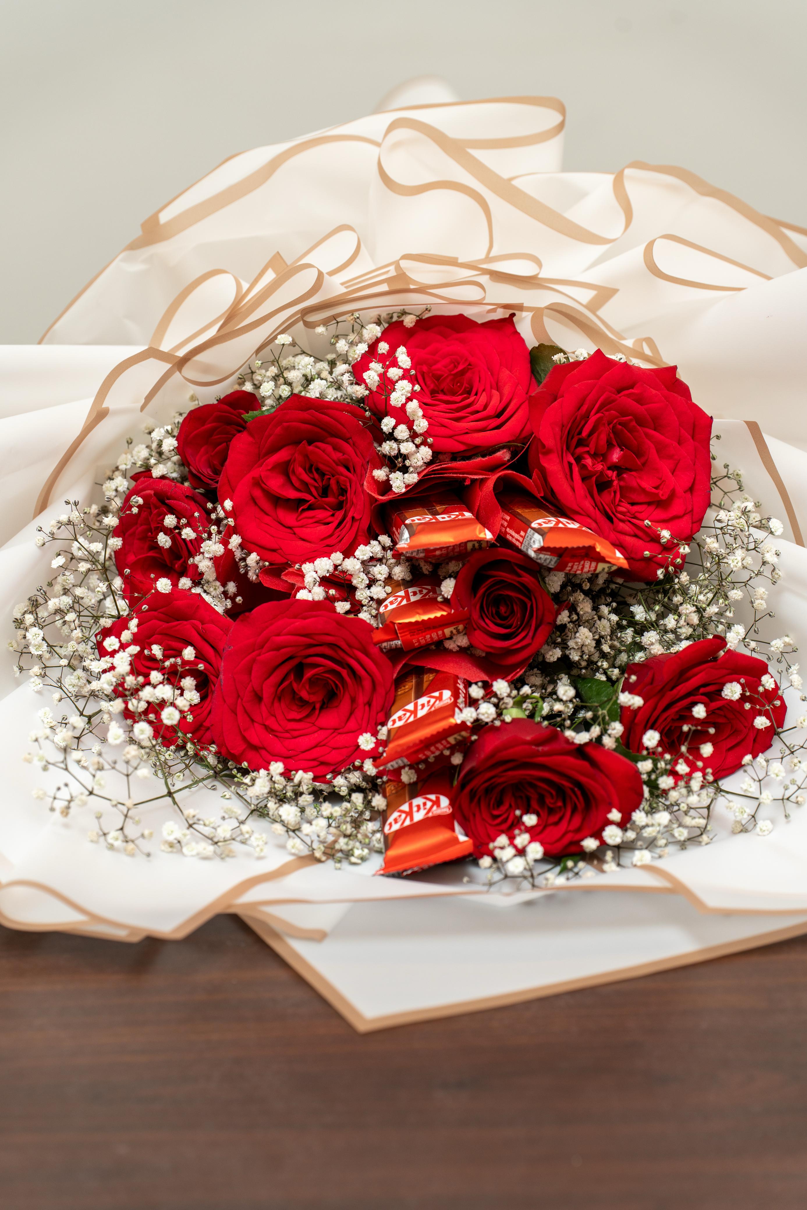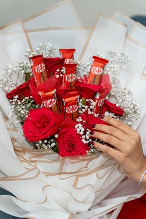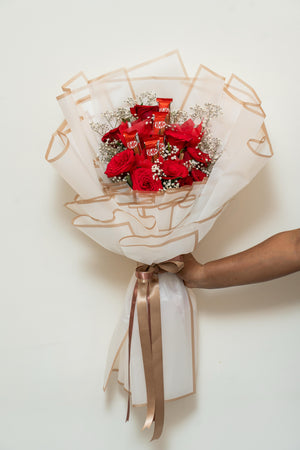 The rich red roses speak of affection and passion, while the Kit-Kat chocolates add a fun, sweet twist that makes this bouquet perfect for easygoing Valentine moments, surprise gestures, or simply making someone’s day brighter.