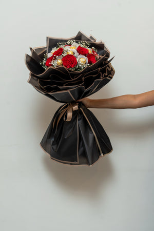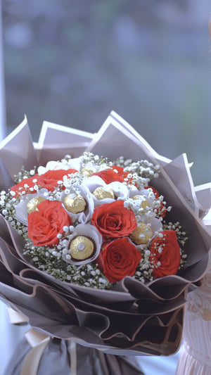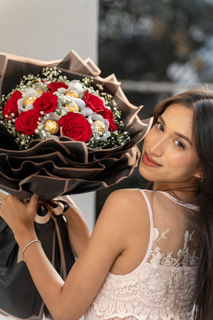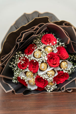 This thoughtfully curated arrangement pairs classic red roses, symbolising deep love and desire, with indulgent Ferrero Rocher chocolates that add a rich, irresistible sweetness to the moment.