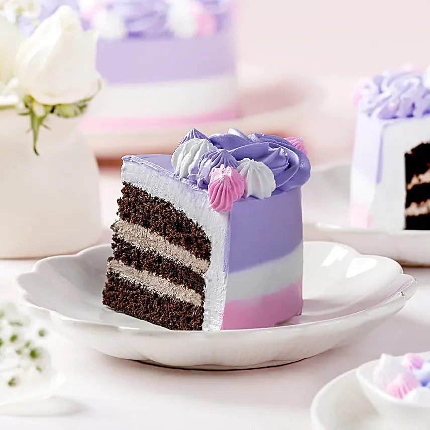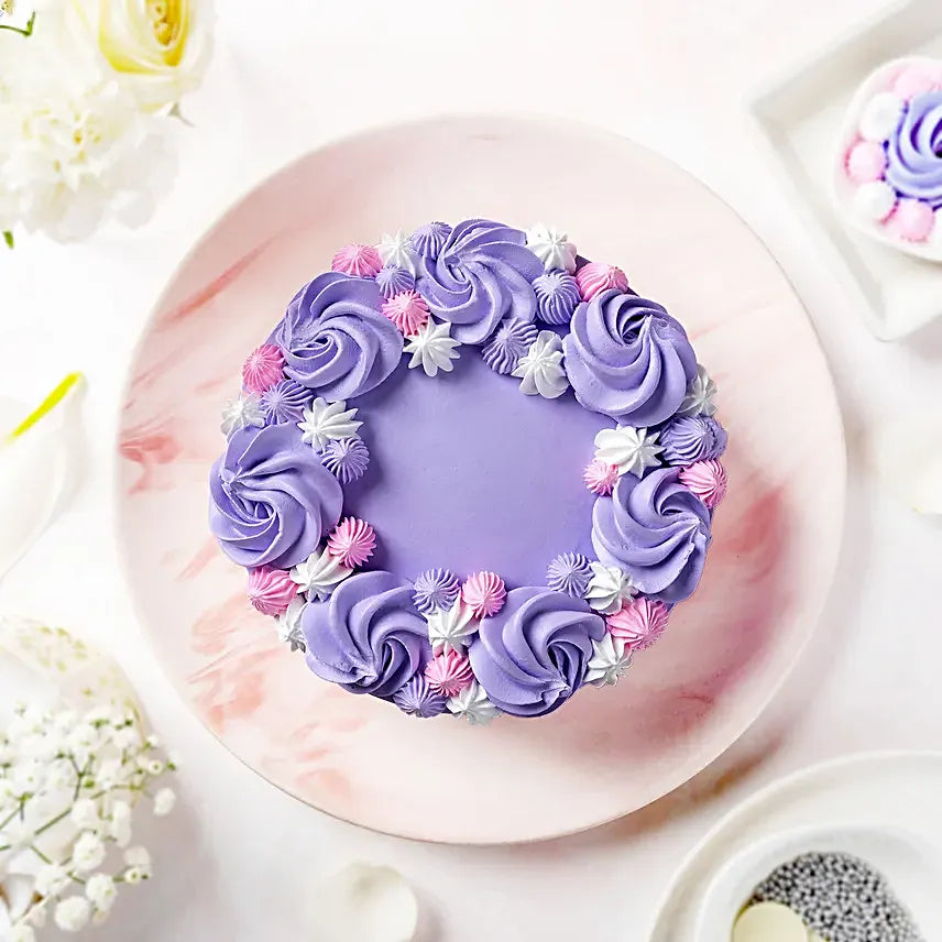 A delightful round cream cake in a dreamy purple–pink shade, crafted to please both the eyes and the taste buds. With its rich chocolate base and elegant pastel tones, this cake makes the perfect centerpiece for any celebration.