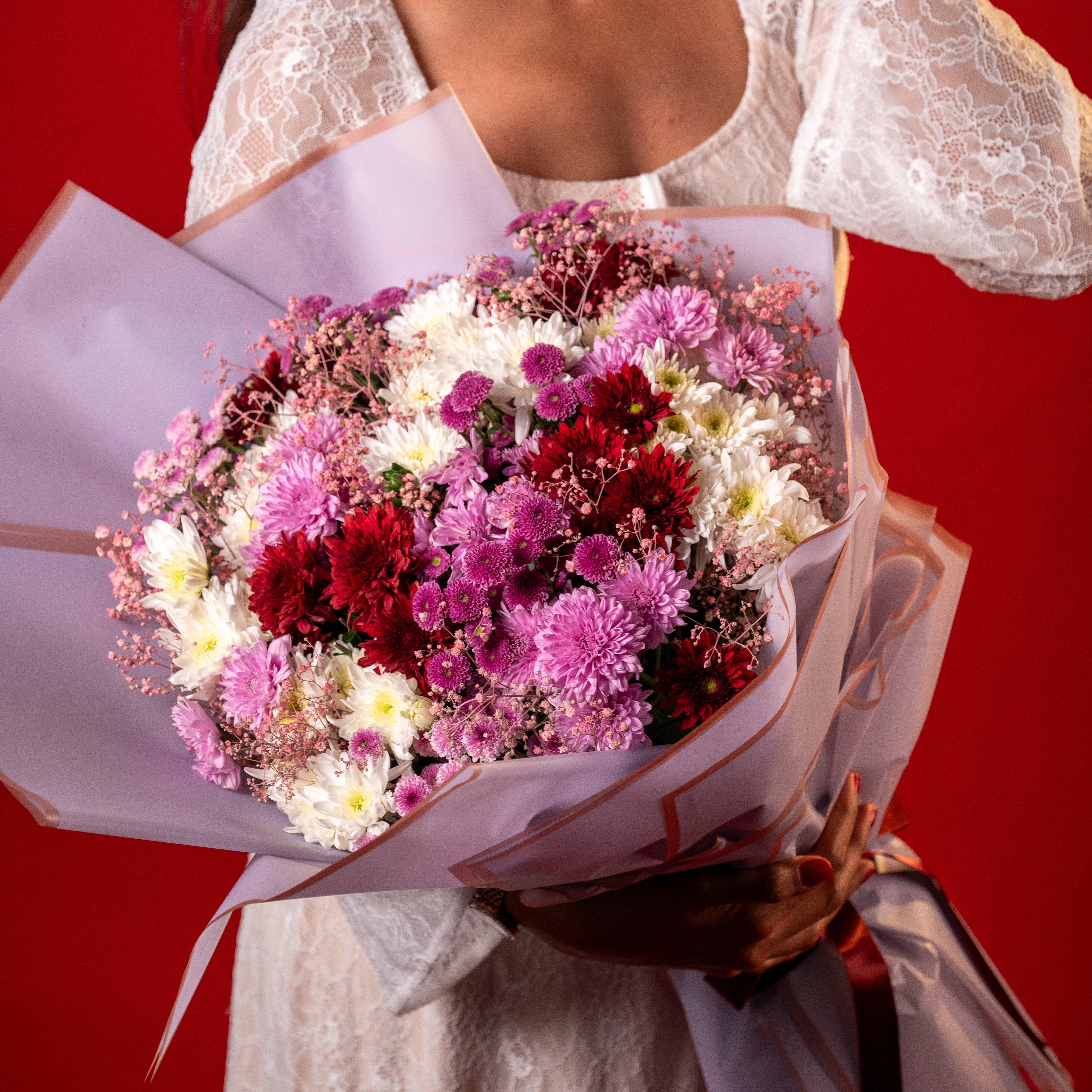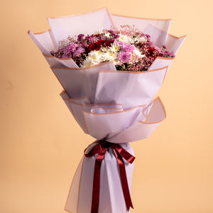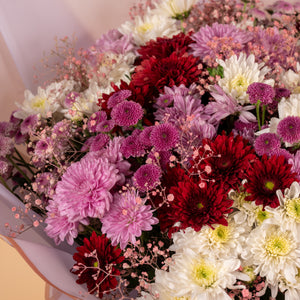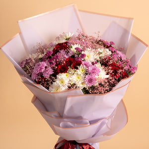 A joyful celebration of colours and emotions, this bouquet features mixed chrysanthemums in soft, radiant hues. Each bloom carries its own meaning — from cheer and friendship to honesty and devotion — coming together like a gentle symphony of love and warmth. Wrapped in a delicate combination of white and lilac packing, the arrangement feels fresh, elegant, and full of charm.