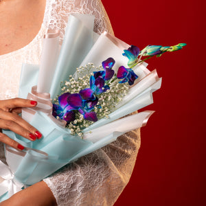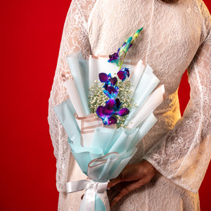 This charming arrangement showcases the serene beauty of fresh blue orchids paired with delicate gypsy fillers. The blue orchids, with their striking hue, symbolise peace, uniqueness, and admiration, while the soft gypsy accents add a light, airy touch to the bouquet. Wrapped in crisp white packing paper and tied with a neat ribbon knot, this petite arrangement radiates grace and freshness—perfect for brightening someone’s day or adding an elegant touch to any occasion.