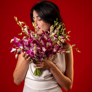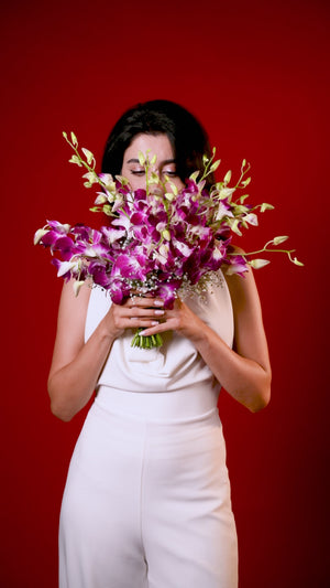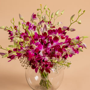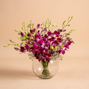 Striking and graceful, this arrangement brings together the exotic charm of purple orchids, the lush greenery of dracaena leaves, and the delicate touch of gypsy fillers. The purple orchid, with its vibrant hue, symbolises admiration, dignity, and beauty, while the dracaena adds structure and depth, creating a perfect balance. Soft gypsy accents complete the look, lending a light, airy elegance to the design.