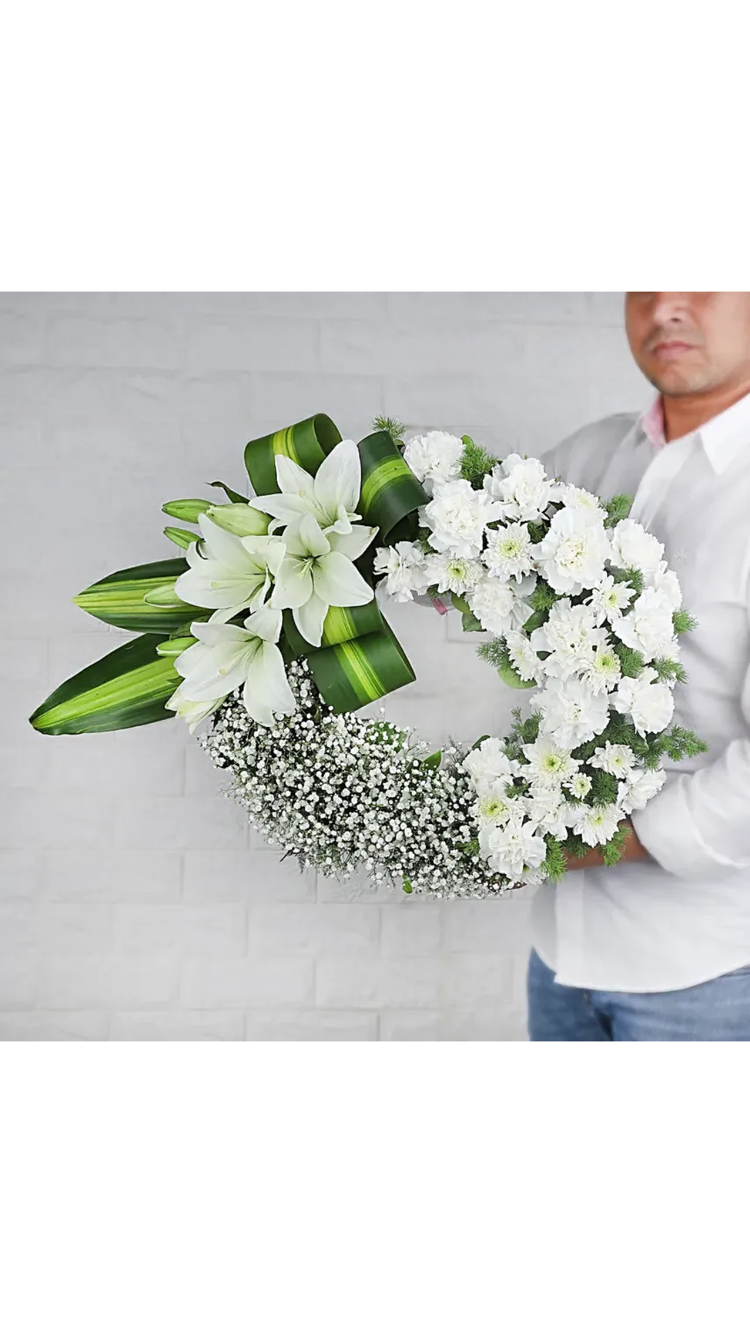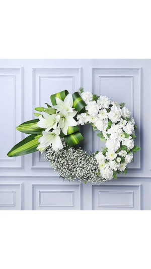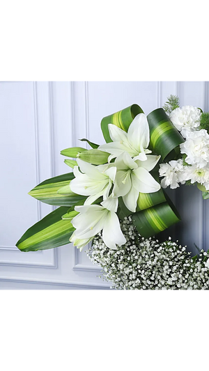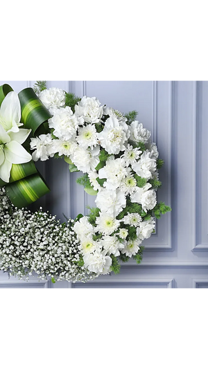 A graceful and elegant wreath, Pure Serenity brings together unscented white Asiatic lilies, white daisies, and white carnations in a harmonious arrangement. Accented with green and yellow Victoria leaf fillers, delicate ficus benjamina leaves, ping pong fillers, and airy white gypsy flowers, this wreath conveys peace, respect, and timeless beauty. Designed on green oasis floral foam for longevity, it is a thoughtful tribute for memorials, ceremonial décor, or occasions where elegance and reverence are paramount.