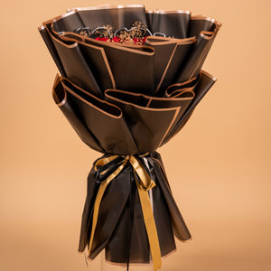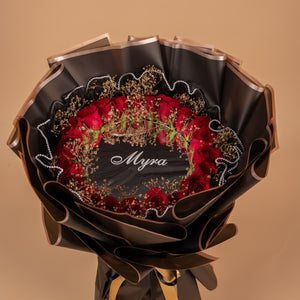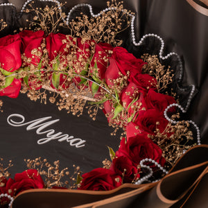 A bouquet that captures passion and elegance in every detail, this arrangement brings together the timeless beauty of red roses, the delicate charm of gypsy fillers, and the bold sophistication of black pearls. Resting on a mirror base, it reflects love and desire from every angle, while the premium black packing adds a dramatic, modern touch.