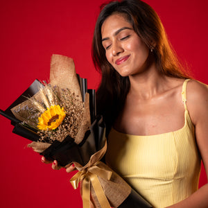 This cheerful bouquet pairs the radiant charm of sunflowers with the delicate beauty of limonium for a fresh and uplifting arrangement. Sunflowers symbolise adoration, loyalty, and positivity, while limonium adds soft texture and a touch of elegance. Wrapped in premium black paper and finished with a neat ribbon knot, this bouquet is a perfect choice to brighten someone’s day with warmth and joy.