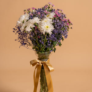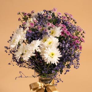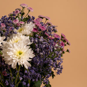 Fresh and enchanting, this arrangement brings together the serene beauty of white chrysanthemums, the charm of purple button flowers, the grace of white carnations, and the delicate texture of limonium. The chrysanthemums symbolise honesty and devoted love, while carnations represent admiration and purity. The pop of purple buttons adds vibrancy, and the airy limonium ties the arrangement together with an elegant, romantic touch.