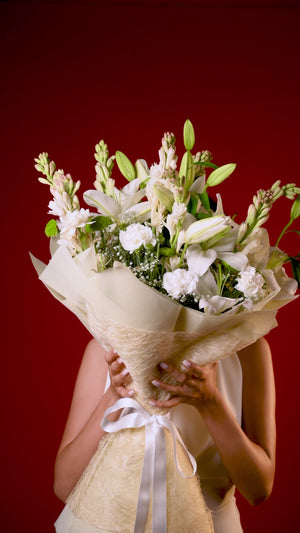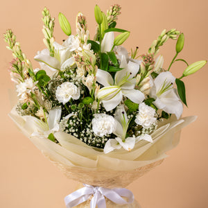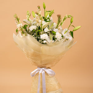 Soft, fresh, and graceful, this bouquet brings together a serene medley of blooms. The tube rose with its sweet fragrance symbolises purity and charm, while white lilies embody grace and devotion. Gentle green button flowers add a lively touch, complemented by the romantic blush of jumilia roses and the timeless beauty of white carnations. Wrapped in premium white packing, the arrangement radiates sophistication and serenity in every detail.
